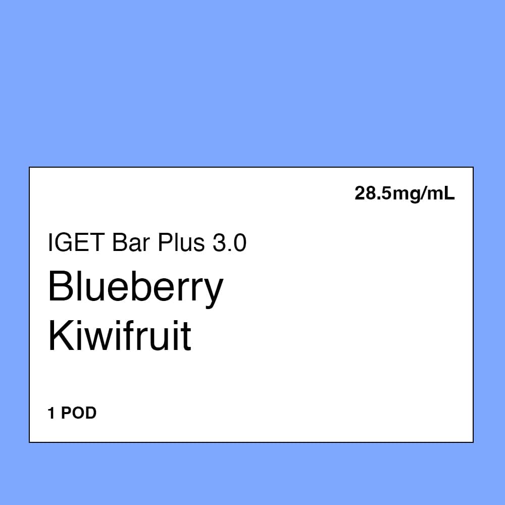IGET Bar Plus 3.0 Pod – Blueberry Kiwifruit• Premium nicotine salt eLiquid• Up to 10,000 puffs per pod• For use with the IGET Bar Plus V1, V2, & V3 device