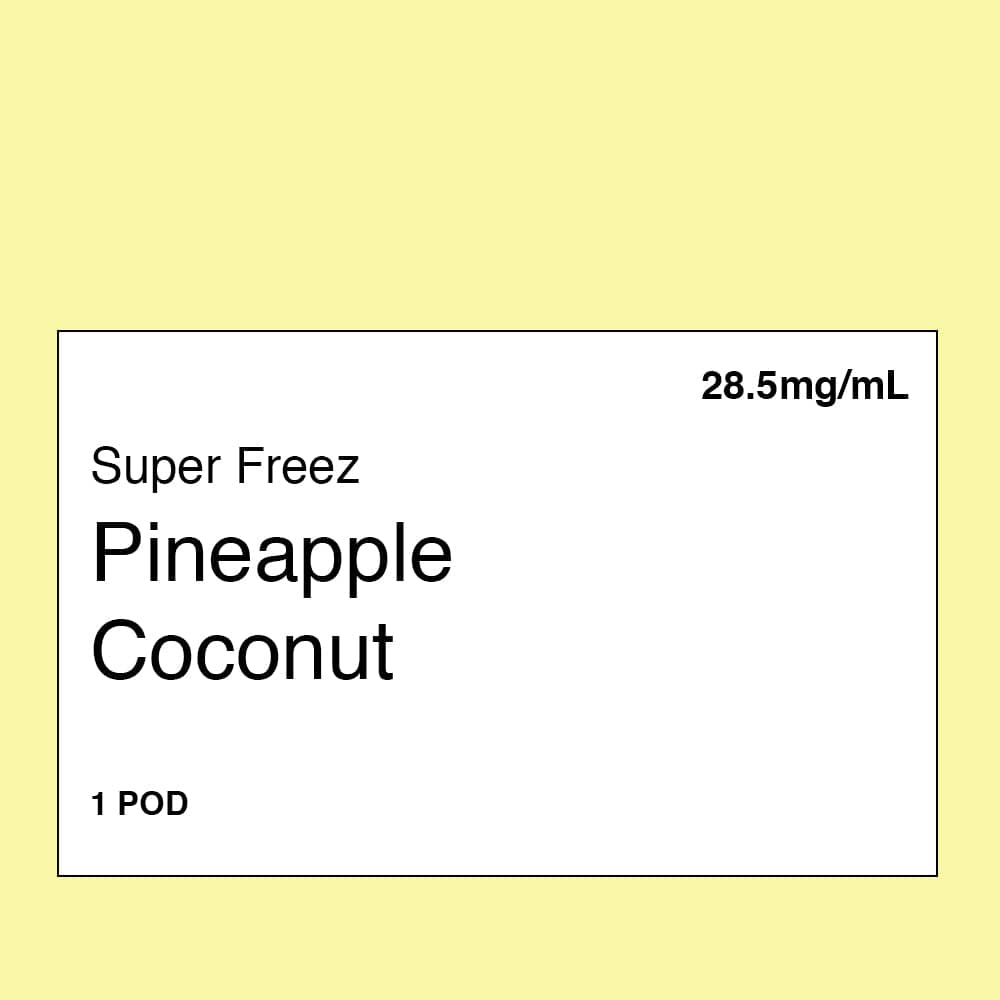 Super Freez Pod - Pineapple Coconut• Each pack contains 1x 19mL pod• Nicotine salt eLiquid• For use exclusively in the Super Freez Device